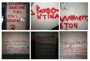 Έγραψαν συνθήματα με κόκκινη μπογιά κατά του νομοσχεδίου για την Παιδεία, για τον Δημήτρη Κουφοντίνα, αλλά και για το θέμα των ημερών που αφορά στον χώρο του πολιτισμού με την υπόθεση Λιγνάδη .