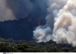 Η φωτιά ξεκίνησε να καίει στα Βίλια το μεσημέρι της Δευτέρας (16/08) και από εκείνη η στιγμή καίει ανεξέλεγκτη.
