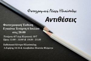 Η Φωτογραφική Λέσχη Ηλιούπολης διοργανώνει Έκθεση Φωτογραφίας των μελών της με θέμα “ΑΝΤΙΘΕΣΕΙΣ”, από την Τετάρτη 6 έως και την Κυριακή 10 Ιουλίου 2022, καθημερινά από 11:00 έως 13:00 & από 19:30 έως 21:30, στο Εκθεσιακό Κέντρο του Δήμου Ηλιούπολης, Λ. Ειρήνης 14-16 & Αλκιβιάδου, στην Πλατεία Φλέμινγκ.