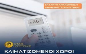 Δύο μεγάλες, κλιματιζόμενες δημοτικές αίθουσες και χώρους θα διαθέσει ο Δήμος Ηλιούπολης στους κατοίκους και τους δημότες της πόλης, ενόψει του επικείμενου καύσωνα, προκειμένου να βρουν ανάσα δροσιάς όσοι το έχουν ανάγκη.