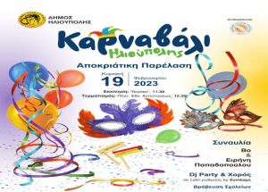Την Κυριακή, 19 Φεβρουαρίου 2023 στις 11:30 π.μ. ο Δήμος Ηλιούπολης σε συνεργασία με τον Εμπορικό Σύλλογο Ηλιούπολης και τον Πρόεδρό του κ. Θανάση Μπίρλη διοργανώνει μεγάλη καρναβαλική παρέλαση, με τη συμμετοχή των Σχολείων, Συλλόγων Γονέων & Κηδεμόνων, Πολιτιστικών Συλλόγων, Φορέων, Σωματείων και πολιτών, στέλνοντας μηνύματα αγάπης, χαράς και κεφιού.