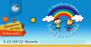- Γιορτή για τα παιδιά στην Ηλιούπολη:Παρασκευή 9 έως Κυριακή 11 Σεπτεμβρίου 2022, 18:00-22:00, Πλατεία Εθνικής Αντιστάσεως