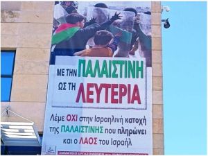 Ζητούμε όχι μόνο να αναθεωρήσετε και να επανατοποθετήσετε το πανό, αλλά και να προβείτε σε εκδηλώσεις κατά της γενοκτονίας του φίλου Παλαιστινιακού λαού.