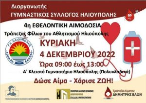 -Την Κυριακή 04 Δεκεμβρίου 2022 και ώρες 09:00 έως 13:00 στο Α΄ Κλειστό Γυμναστήριο Ηλιούπολης θα πραγματοποιηθεί η 4η Εθελοντική Αιμοδοσία της Τράπεζας Αίματος φίλων του Αθλητισμού Ηλιούπολης.
