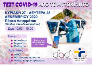 Η δράση του ΕΟΔΥ θα γίνει στο Πάρκο Ασυρμάτου, από τις 10:00 το πρωί έως τις 15:00 το μεσημέρι, όπου οι πολίτες θα προσέρχονται αποκλειστικά με όχημα: αυτοκίνητο , δίκυκλο , ποδήλατο ή και πατίνι προκειμένου να εξεταστούν.