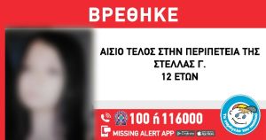 Η Στέλλα Γ. εντοπίστηκε στην περιοχή της Νέας Ιωνίας. Συγκεκριμένα, ευαισθητοποιημένος πολίτης, ο οποίος είχε ενημερωθεί για την εξαφάνισή της Στέλλας κατόπιν της δημοσιοποίησης των στοιχείων της από «Το Χαμόγελο του Παιδιού» στις 10/6/2023, την αναγνώρισε και άμεσα ενημέρωσε τις Αστυνομικές Αρχές.