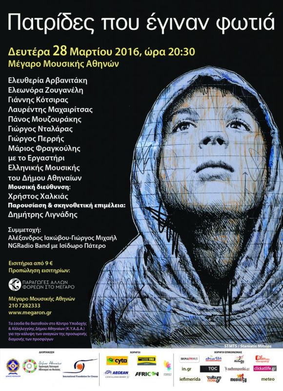 Τη Δευτέρα 28 Μαρτίου στις 20:30 οι: Ελευθερία Αρβανιτάκη, Ελεωνόρα Ζουγανέλη, Γιάννης Κότσιρας, Λαυρέντης Μαχαιρίτσας, Πάνος Μουζουράκης, Γιώργος Νταλάρας, Γιώργος Περρής, Μάριος Φραγκούλης συμπράττουν με το Εργαστήρι Ελληνικής Μουσικής του Δήμου Αθηναίων σε μουσική διεύθυνση Χρήστου Χαλκιά και ενώνουν τις φωνές τους στο Μέγαρο Μουσικής Αθηνών δίνοντας το παρόν αφιλοκερδώς σε αυτή την εκδήλωση που έχει στόχο να ενδυναμώσει την αλληλεγγύη και να συμβάλλει στην κάλυψη των βασικών αναγκών των προσφύγων για την περίοδο που θα παραμείνουν στη χώρα μας. Συμμετέχουν επίσης: NGradio Band με τον Ισίδωρο Πάτερο και Αλέξανδρος Ιακώβου – Γιώργος Μιχαήλ.