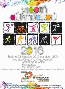 Την Τετάρτη 23 Μαρτίου 2016 και ώρα 18:00, θα πραγματοποιηθεί στο αμφιθέατρο του 1ου Γυμνασίου-Λυκείου (Στρογγυλό) η καθιερωμένη μεγάλη γιορτή του Αθλητισμού της πόλης του Αγ. Δημητρίου.