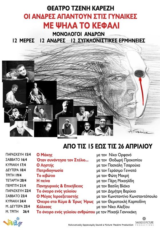 Ο πολιτιστικός οργανισμός Sound & Picture Theatre Production κλείνει την επιτυχημένη φετινή θεατρική χρονιά με το φεστιβάλ ανδρικών μονολόγων Οι άνδρες απαντούν στις γυναίκες με ψηλά το κεφάλι, από τις 15 έως τις 26 Απριλίου, στο θέατρο Τζένη Καρέζη. Μετά την μεγάλη επιτυχία των γυναικείων μονολόγων «Κραυγές γυναικών», 12 ανδρικοί συγκλονιστικοί μονόλογοι, για 12 ημέρες, μετατρέπουν το τέλος της θεατρικής περιόδου σε μια συναρπαστική θεατρική γιορτή .