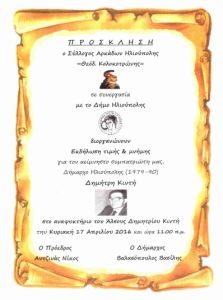 Ο Σύλλογος Αρκαδών Ηλιούπολης "Θεοδ. Κολοκοτρώνης" σε συνεργασία με τον Δήμο Ηλιούπολης, διοργανώνουν Εκδήλωση τιμής & μνήμης για τον αείμνηστο συμπατριώτη μας, Δήμαρχο Ηλιούπολης (1979-1990) Δημήτρη Κιντή, στο αναψυκτήριο του Άλσους Δημητρίου Κιντή την Κυριακή 17 Απριλίου 2016 και ώρα 11:00 π.μ.