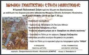 Εκδήλωση - Ιωνική Πολιτιστική Στέγη Ηλιούπολης Εντός των τειχών 21 Μαϊου 2016 Ιωνική Πολιτιστική Στέγη Ηλιούπολης Μουσείο Εθνικής Αντίστασης Ηλιούπολη Κωνσταντινούπολη Ηλιούπολη για όλους Ήλιδα www.ilioupoligiaolous.gr Προβλήθηκε 2210 φορές Δείτε Επίσης: Εντός των τειχών Δείτε τα Όλα Ειδικό σχολείο -''H έκθεση της Διεύθυνσης Υγειονομικού Ελέγχου και Περιβαλλοντικής Υγιεινής της Περιφέρειας Αττικής'' 17 Μαρτίου 2026 Η έκθεση της Διεύθυνσης Υγειονομικού Ελέγχου της Περιφέρειας ζητά την άμεση αποκατάσταση των φθορών για την προστασία της υγείας μαθητών, προσωπικού και διδασκόντων. ΠΑΣΟΚ Ηλιούπολης - Οι 22 εκλεγόμενοι σύνεδροι. 16 Μαρτίου 2026 Ο κατάλογος των τελικά είκοσι δύο (22) εκλεγόμενων συνέδρων με τους σταυρούς που έλαβαν. Ισοπαλία για τον ΧΑΡΑΥΓΙΑΚΟ και τον ΦΩΣΤΗΡΑ ΗΛΙΟΥΠΟΛΗΣ 13 Μαρτίου 2026 ΚΥΡΙΑΚΗ 15.03.2026 ΚΑΙ ΩΡΑ 03.30 Μ.Μ. Ήττα για την ΗΛΙΟΥΠΟΛΗ ''5η αγωνιστική'' - Super League 2 (play out) 13 Μαρτίου 2026 Κυριακή 15.03.2026 Νίκη για την ΔΙΑΝΑ 13 Μαρτίου 2026 ΣΔΑΒΒΑΤΟ 14.03.2026 ΚΑΙ ΩΡΑ 03.30 Μ.Μ. ΑΙΓΑΛΕΩ - ΗΛΙΟΥΠΟΛΗ ''5η αγωνιστική'' - Super League 2 (play out) 12 Μαρτίου 2026 ΚΥΡΙΑΚΗ 15.03.2026 ΚΑΙ ΩΡΑ 03.00 Μ.Μ. 23η αγωνιστική για ΔΙΑΝΑ, ΧΑΡΑΥΓΙΑΚΟ και 22η αγωνιστική για ΦΩΣΤΗΡΑ ΗΛΙΟΥΠΟΛΗΣ 12 Μαρτίου 2026 ΣΑΒΒΑΤΟ 14 & ΚΥΡΙΑΚΗ 15.03.2026 ΚΑΙ ΩΡΑ 03.30 Μ.Μ. Ηλιούπολη: Μήνυσε αστυνομικούς για παράβαση καθήκοντος το 2022 και ακόμα περιμένει το δικαστήριο 09 Μαρτίου 2026 Η απίστευτη ιστορία μίας γυναίκας που έπεσε θύμα τροχαίου
