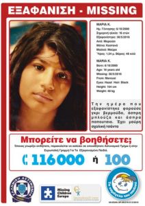 Σύμφωνα με το Χαμόγελο του Παιδιού, στις 30/05/2016 και ώρα 22:00, εξαφανίστηκε από το σπίτι της στην περιοχή του Αμαρουσίου, η Μαρία Κ., 16 ετών.