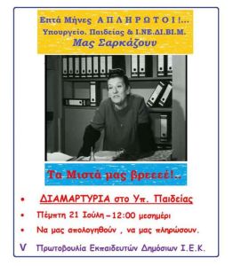 Έστω και «ντάλα καλοκαίρι» , λοιπόν, έστω μ’ ένα καταθλιπτικό τσουνάμι απάθειας να βαραίνει τον Κόσμο , κάποιοι από μας θα βρεθούμε 12 το μεσημέρι της Πέμπτης 21 Ιουλίου στο υπ. Παιδείας. Να ζητήσουμε το Λόγο , να μας απολογηθούν , να μας πληρώσουν τα δεδουλευμένα μας.