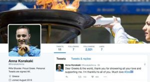 - O δημιουργός του ψεύτικου προφίλ στο twitter απάντησε ως Αννα Κορακάκη στην ανάρτηση του Αλέξη Τσίπρα με την οποία της έδινε συγχαρητήρια για το χρυσό μετάλλιο