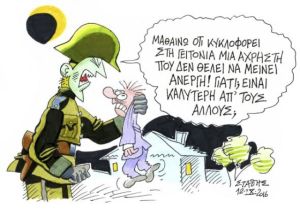 Δυστυχώς, έχει εξαφανισθεί τελευταίως και ο κ. Μιχελογιαννάκης. Και δεν ξέρω ποιος θα διαπραγματευθεί για το χρέος! Ο Ποκοπίκο; Ο Πινόκιο; Ποιος θα πει πάλι ότι «δεν μπορούσαμε να κάνουμε αλλιώς», όπως είπε ο Βελουχιώτης, πριν να επιβάλει ΕΝΦΙΑ στο Ασυλο Ανιάτων, στο Χαμόγελο του Παιδιού, στο Ορφανοτροφείο «Μέλισσα» - βαρέθηκα το ξεφτιλίκι.