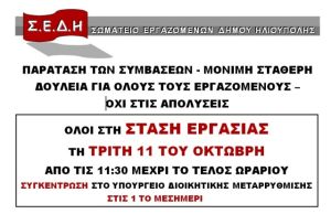 Το ΣΩΜΑΤΕΙΟ ΕΡΓΑΖΟΜΕΝΩΝ του δήμου ΗΛΙΟΥΠΟΛΗΣ καλεί όλους τους εργαζόμενους ανεξαρτήτως σχέσης εργασίας να πάρουν μαζικά μέρος στη ΣΤΑΣΗ ΕΡΓΑΣΙΑΣ τη Τρίτη 11 του Οκτώβρη από τις 11:30 το μεσημέρι μέχρι τη λήξη του ωραρίου όπως και στη συγκέντρωση μπροστά στο Υπουργείο Διοικητικής Μεταρρύθμισης στις 1 το μεσημέρι.