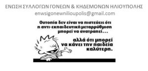 Η Ένωση Συλλόγων Γονέων & Κηδεμόνων Ηλιούπολης, στέκεται στο πλευρό των παιδιών, αμετακίνητη στην πάγια θέση της για Δωρεάν Δημόσια Παιδεία για όλα τα παιδιά, χωρίς συγχωνεύσεις σε κανένα σχολείο της Πόλης και της χώρας μας. Δεν χρειάζεται να ανασύρουμε κάθε φορά τα άρθρα του Συντάγματός, την Δημοκρατία και την Ιστορία μας, για να αντιληφθούν οι υπηρεσιακοί παράγοντες ότι δεν μιλάμε για λιμάνια, πάρκα ή αεροδρόμια αλλά … για παιδιά !!!