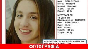 Στις 16 Οκτωβρίου και στις 17:30, εξαφανίστηκε από την περιοχή της Πετρούπολης, η 13χρονη Μπουράτα Ζωή. Η ανήλικη φορούσε μαύρη αθλητική φόρμα και μωβ αθλητικά παπούτσια. Έχει καστανά μαλλιά, καστανά μάτια, ύψος 155 εκ. και βάρος 42 κιλά.