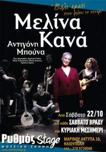 Από το Σάββατο 22 Οκτωβρίου και κάθε Σάββατο βράδυ και Κυριακή μεσημέρι η Μελίνα Κανά, η Αντιγόνη Μπούνα και πέντε εξαιρετικοί μουσικοί συναντιούνται σε όλα όσα θα θέλαμε να τραγουδήσουμε μαζί της. Σε τραγούδια - σταθμούς στη μέχρι τώρα πορεία της, σε τραγούδια από την προσωπική της δισκογραφία που σπάνια ερμηνεύει επί σκηνής αλλά και σε παλιότερες δημιουργίες που ξεκινούν από δρόμους λαϊκούς και φτάνουν μέχρι αυτούς του ρεμπέτικου.