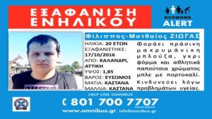 Ο Φίλιππος-Ματθαίος ΖΙΩΓΑΣ, 20 ετών, εξαφανίστηκε στις 17/10/16 από το Χαλάνδρι Αττικής. Φοράει πράσινη μακρυμάνικη μπλούζα, γκρι φόρμα και αθλητικά παπούτσια χρώματος μπλε με πορτοκαλί.