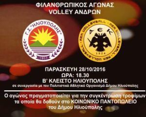 Σκοπός του φιλανθρωπικού αγώνα της 28ης Οκτωβρίου 2016 ημέρα Παρασκευή και ώρα 18:30 στο Β κλειστό γυμναστήριο Ηλιούπολης, είναι να μαζευτούν όσα περισσότερα τρόφιμα μακράς διάρκειας, για να διατεθούν στο ΚΟΙΝΩΝΙΚΟ ΠΑΝΤΟΠΩΛΕΙΟ του Δήμου Ηλιούπολης.
