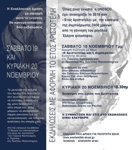Η Εναλλακτική Δράση, σας καλεί να συμμετέχετε στις εκδηλώσεις που θα πραγματοποιήσει με αφορμή το γεγονός της ανακήρυξης του 2016 σαν “Έτος Αριστοτέλη”, από την UNESCO, λόγω της συμπλήρωσης 2400 χρόνων από τη γέννηση του μεγάλου ‘Έλληνα φιλοσόφου