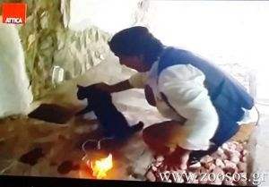 Η «πλάκα» όμως συνεχίζεται και ο ηθοποιός – όπως θα δείτε και στο σχετικό βίντεο, που τράβηξε αναγνώστης του www.zoosos.gr – δένει στην ουρά του ζώου ένα σχοινί το οποίο καταλήγει σε στουπί, που έχει βρέξει με εύφλεκτη ουσία και στη συνέχεια του βάζει φωτιά. Η γάτα κατατρομαγμένη τρέχει και εξαφανίζεται από το πλάνο ενώ το στουπί στην ουρά του καίγεται…