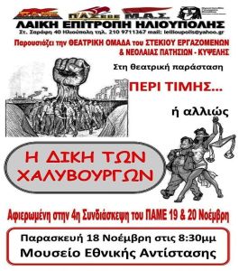 Η Λαϊκή Επιτροπή Ηλιούπολης, την Παρασκευή 18 Νοέμβρη 2016 στις 8:30 μμ στο Μουσείο Εθνικής Αντίστασης, ανεβάζει την θεατρική παράσταση της Θεατρικής Ομάδας του Στεκιού Νεολαίας & Εργαζομένων Πατησιών – Κυψέλης "Περί τιμή ή αλλιώς… Η ΔΙΚΗ ΤΩΝ ΧΑΛΥΒΟΥΡΓΩΝ"
