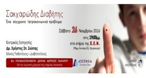 Το Σάββατο 26 Νοεμβρίου 2016 θα πραγματοποιηθεί ομιλία για τον Σακχαρώδη Διαβήτη με κεντρικό εισηγητή τον Δρ. Χρήστο Ζούπα, ειδικό παθολόγο - διαβητολόγο.