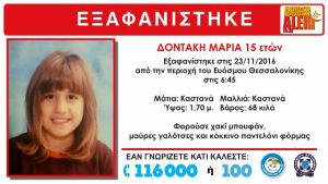 Στις 23/11/16 στις 06:45, εξαφανίστηκε από την περιοχή του Ευόσμου Θεσσαλονίκης, η Δοντάκη Μαρία, 15 ετών.