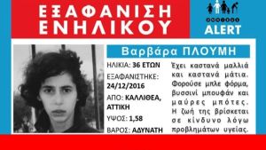 Η 36χρονη Βαρβάρα Πλούμη εξαφανίστηκε στις 24/12/16, απογευματινές ώρες, από το Κέντρο Πολιτισμού «Ίδρυμα Σταύρος Νιάρχος» στην Καλλιθέα Αττικής.