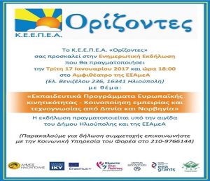 Tο Κ.Ε.Ε.Π.Ε.Α. «Ορίζοντες» διοργανώνει Ενημερωτική Εκδήλωση υπό την αιγίδα του Δήμου Ηλιούπολης και της ΕΣΑμεΑ, την Τρίτη 17 Ιανουαρίου 2017 και ώρα 18:00 στο Αμφιθέατρο της ΕΣΑμεΑ (Ελ. Βενιζέλου 236, Ηλιούπολη) με θέμα: