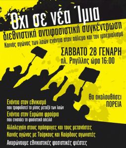 Καλούμε όλους τους αγωνιστές, αντιφασίστες, ενεργούς πολίτες να δώσουμε το παρόν στη διεθνιστική αντιφασιστική συγκέντρωση στην πλατεία Ρηγίλλης για να προβάλλουμε την προοπτική της αλληλεγγύης των λαών ως απάντηση στο φασιστικό και εθνικιστικό μίσος.