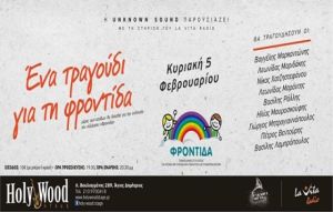 Μία φιλανθρωπική εκδήλωση, ένα μοναδικό live την Κυριακή 5 Φεβρουαρίου στο φιλόξενο HolyWood Stage, μέρος των εσόδων θα διατεθούν για την στήριξη του Πανελληνίου Συλλόγου για άτομα με εγκεφαλική παράλυση και σύνδρομο down «Φροντίδα».
