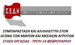 Το Δ.Σ. του ΣΩΜΑΤΕΙΟΥ, σας καλεί να πάρετε μέρος στη ΣΤΑΣΗ ΕΡΓΑΣΙΑΣ την ΤΡΙΤΗ 14 ΦΕΒΡΟΥΑΡΙΟΥ από τις 12:00 μέχρι το τέλος ωραρίου της πρωινής βάρδιας και τις 2 πρώτες ώρες της απογευματινής βάρδιας εκφράζοντας συμπαράσταση και αλληλεγγύη στον αγώνα των μικρών και μεσαίων αγροτών.