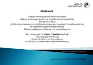 Σας περιμένουμε την Τετάρτη 15 Μαρτίου στις 7 μ.μ. στο Δημαρχείο Ηλιούπολης (Σοφοκλή Βενιζέλου 114 & Κουντουριώτου) στο θέατρο του Δημαρχειακού Μεγάρου.