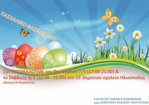 Ο σύλλογος γονέων και κηδεμόνων του 15ου δημοτικού σχολείου, σας προσκαλεί στο πασχαλινό bazaar του, το οποίο περιλαμβάνει δημιουργίες των μαθητών και των γονιών του σχολείου μας.