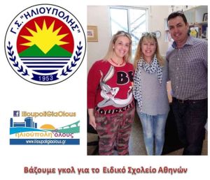 Η συνάντηση με την Κυρία Κωνσταντίνα Κολιζέρα, Διευθύντρια του Ειδικού Σχολείου Αθηνών πραγματοποιήθηκε σήμερα Πέμπτη 11 Μαΐου 2017, και παραδόθηκαν τα χρήματα από την δράση που είχαμε σκεφτεί και με χαρά αποδέχτηκε ο Γ.Σ.ΗΛΙΟΥΠΟΛΗΣ (τμήμα ποδοσφαίρου): "Βάζουμε γκολ για το Ειδικό Σχολείο Αθηνών", και υλοποιήθηκε με τα 24 γκολ που οι παίκτες του Γ.Σ.Η. έβαλαν στο Πρωτάθλημα που τελείωσε την προηγούμενη εβδομάδα.