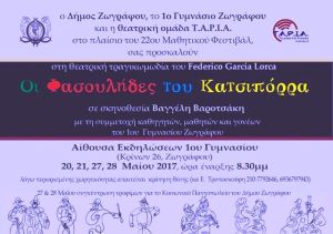 Η Θεατρική Ομάδα T.A.P.I.A (Teachers And Parents In Action ) παρουσιάζει τη τραγικωμωδία του Federico Garcia Lorca: ΟΙ ΦΑΣΟΥΛΗΔΕΣ ΤΟΥ ΚΑΤΣΙΠΟΡΡΑ -Los titeres de Cachiporra, σε σκηνοθεσία του Βαγγέλη Βαροτσάκη στην αίθουσα εκδηλώσεων του 1ου Γυμνασίου Ζωγράφου (Κρίνων 26) , στις 20,21,27 & 28 Μαίου 2017 στις 20:30 μ.μ.