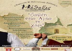Στις 17 Ιουνίου, στο δημοτικό θέατρο Ηλιούπολης «Δημήτριος Κιντής», ο χορευτικός πολιτιστικός σύλλογος "Μέθεξις", θα παρουσιάσει μια μοναδική μουσικοχορευτική παράσταση η οποία θα φέρει τον τίτλο, ''Ζιαφέτι στων αγίων τη Χάρη''.