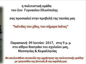 Η πολιτιστική ομάδα του 2ου Γυμνασίου Ηλιούπολης, σας προσκαλεί στην προβολή της ταινίας μας: '' Ικετιδες του χθες, του σήμερα Ικέτες ''.