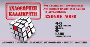 Σας προσκαλούμε στην εκδήλωση που διοργανώνουμε με θέμα την αναθεώρηση του Καλλικράτη, την Παρασκευή 23 Ιουνίου, στις 8 μ.μ. στο Α΄ ΚΑΠΗ Ελληνικού - Αργυρούπολης (Αλεξιουπόλεως 27).