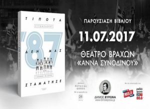 Ο Δήμος Βύρωνα τιμά τους δημότες του και τους προσκαλεί στην παρουσίαση του βιβλίου του Γιάννη Φιλέρη «’87 - Τίποτα δεν μας σταμάτησε», την Τρίτη 11 Ιουλίου, ώρα 20:30, στο Θέατρο Βράχων «Άννα Συνοδινού».