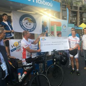 Μαζί τους, οι δύο ποδηλάτες είχαν και μια επιταγή 6.372 ευρώ, προκειμένου να την παραδώσουν στους ανθρώπους του Χαμόγελου του Παιδιού μία από τις τέσσερις οργανώσεις, στις οποίες οι δύο φίλοι αποφάσισαν να διαθέσουν τα χρήματα που συγκέντρωσαν μ' αυτήν την πρωτοβουλία τους.