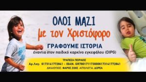 Δράση βοήθειας για τον 5χρονο Χριστόφορο, ο οποίος έχει διαγνωστεί με Διάχυτο Γλοίωμα Γέφυρας Εγκεφάλου (DIPG- καρκίνος εγκεφάλου) διοργανώνει ο Φάρος Ζωής (Σύλλογος υποστήριξης οικογενειών με άτομα που νοσούν από σοβαρές ασθένειες).