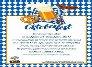 Το Neue Schule Athen, το ελληνογερμανικό σχολείο της Ηλιούπολης, οργανώνει για 3η χρονιά τη δική του Γιορτή Μπύρας (Οktoberfest) το Σάββατο 21 Οκτωβρίου 2017, 11:00 - 18:00, στην αυλή του Σχολείου του (Νεάρχου 52 - 54, Ηλιούπολη).