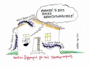 Πρέπει να μπουζουριάζονται αυτεπαγγέλτως (και ει δυνατόν με ιδιώνυμο) οι πρώην σύντροφοι του Σαρανταποδαρούσα που προσπαθούν να σώσουν τα σπίτια του κοσμάκη. Κάτι τύποι γραφικοί και λαϊκιστές που χαλάνε την πιάτσα του real estate. Ξέρει απ’ αυτά ο Σαρανταποδαρούσας. Αφού ενσυνειδήτως αλάλιασε στους φόρους τους μικρομεσαίους, να μην τους ξεσπιτώσει κιόλας;