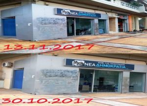 Η ερώτηση μας λοιπόν προς τα στελέχη της Νέας Δημοκρατίας είναι πότε ''έσπασε' ο υαλοπίνακας και πότε ''βάφτηκε'' η πινακίδα των γραφείων; Σίγουρα όχι το βράδι της 11ης Νοεμβρίου 2017.