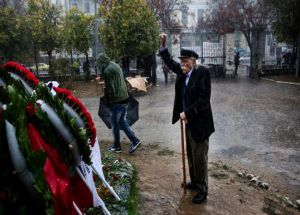 Χωρίς ομπρέλα, χωρίς συνοδό, μόνος του με υψωμένη τη γροθιά στα 95 του χρόνια.