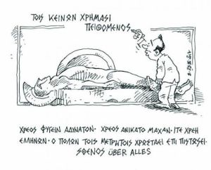Έχει πλάκα για τους ξένους Αποικιοκράτες και τους ιθαγενείς Σέμπρους (και σμπίρους) να βλέπουν έναν τύπο που πάει και προσκυνάει στη Μακρόνησο να τους παραδίδει κι αυτός, όπως οι επίγονοι των συνεργατών της κατοχής, την Ελλάδα στο πιάτο. Ένα πιάτο γεμάτο αίματα από μισθούς, οικίες, όνειρα, συντάξεις, υποδομές, προοπτικές.